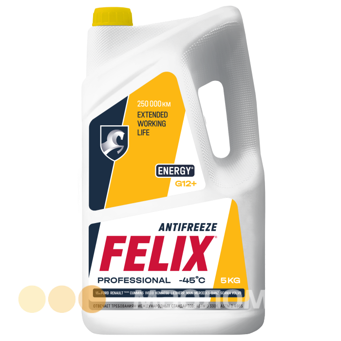 Антифриз Felix Energy — антифриз FELIX® ENERGY представляет собой жидкость охлаждающую низкозамерзающую на основе этиленгликоля высшего сорта и специально очищенной воды, не содержащую аминов, фосфатов, боратов и силикатов. В качестве ингибиторов коррозии содержит пакет органических присадок с добавлением специального компонента для усиленного противодействия коррозии. Предназначен для высоконагруженных двигателей, а также легковых автомобилей, работающих в тяжелых условиях эксплуатации.